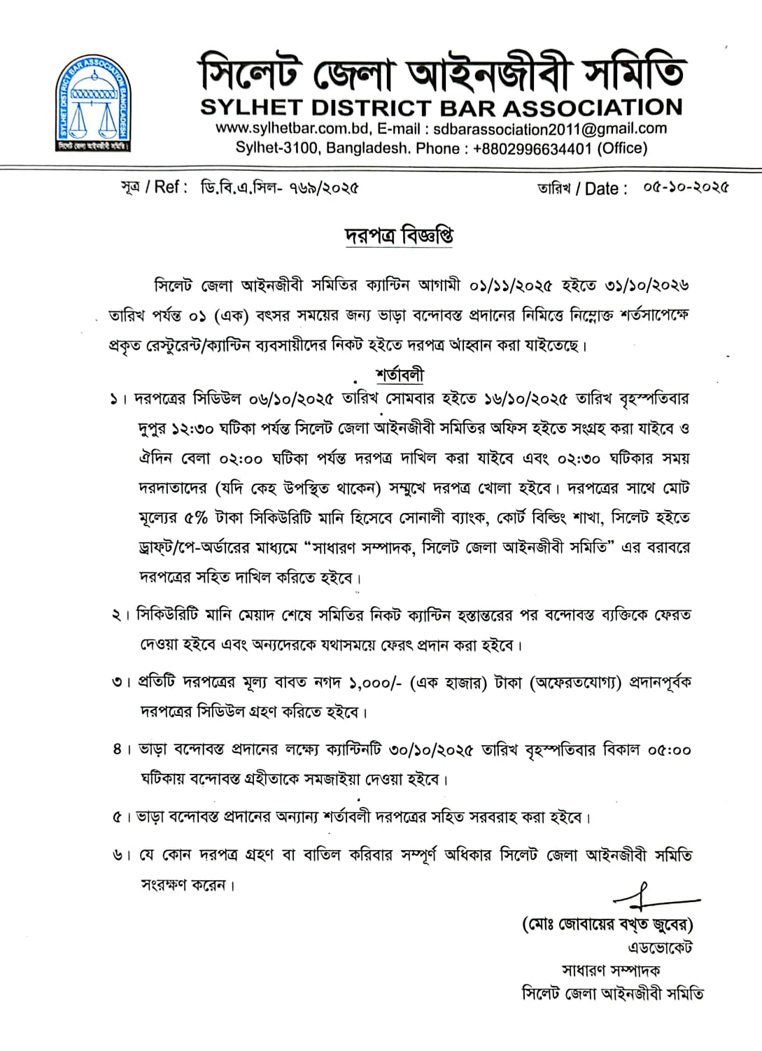 ক্যান্টিন দরপত্র বিজ্ঞপ্তি